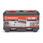The Crescent 27 piece 1/4” drive SAE and metric mechanics tool set contains a heavy duty 72 tooth 1/4” drive quick release ratchet, allowing for quick socket exchanges and a compact head design allowing for access to more fasteners. The sets 6 point metric shallow and deep sockets feature off-corner loading technology virtually eliminate fastener rounding and feature stamped size markings for easy identification.