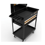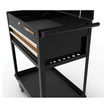 The heavy-duty two-drawer utility cart from GEARWRENCH is easy to assemble and stands a full 42 inches tall when assembled. The storage capacity of the till and two drawers is over 7,600 cubic inches. Each drawer's ball bearing slides are rated to a 100lb load, and the overall cart load capacity is over 450 pounds. The drawer pulls feature a trigger latch retention system that keeps them securely closed when mobile. The bottom tray also features corner bumpers and hidden caster bolts, providing a large, smooth, clear storage surface. The casters are 5” x 2” polyurethane, with dual locking top pedal brake - 2 swivel casters and 2 fixed – so this cart goes where you push it and stays where you park it. This cart also includes an external power tool rack and a storage area in the till where you can store long screwdrivers or pry bars and still lock the lid. All storage areas come with a black EVA foam liner to protect the interior surfaces and prevent tools from sliding.