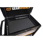 The GEARWRENCH heavy-duty 4 drawer tool cart is easy to assemble and the storage capacity of the till and four drawers is over 10,700 cubic inches. Each drawer's ball bearing slides are rated to a 100lb load, and the overall cart load capacity is over 600 pounds. The drawer pulls feature a trigger latch retention system that keeps them securely closed when mobile. The four legs feature full-length molded bumpers which protect cart and other surfaces . The hidden caster bolts provide a large, smooth, clear storage surface in the bottom tray. The casters are 5” x 2” polyurethane with dual-locking top pedal brake - 2 swivel casters and 2 fixed – so this cart goes where you push it and stays where you park it. This cart also includes an external power tool rack and a storage area in the till where you can store long screwdrivers or pry bars and still lock the lid. All storage areas come with a black EVA foam liner to protect the interior surfaces and prevent tools from sliding.