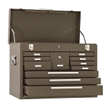 Kennedy® Machinist's Chest, Light Duty, Series: Signature, 26-1/8 in Width, 12-1/8 in Depth, 18-7/8 in Height, 20 ga Thickness, (1) 5-1/2 in H x 5-1/2 in W x 10-7/8 in D HB, (6) 1-1/4 in H x 7-5/8 in W x 10-7/8 in D, (1) 2-5/8 in H x 7-5/8 in W x 10-7/8 in D, (2) 2 in H x 23 in W x 10-7/8 in D, (1) 3 in H x 23 in W x 10-7/8 in D Drawer, 11 Drawers, 3976 cu-in Capacity, Bale Side/Plate Handle, Steel, Powder Coated, Brown Wrinkle