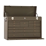 Kennedy® Machinist's Chest, Light Duty, Series: Signature, 26-3/4 in Width, 8-1/2 in Depth, 18 in Height, 20 ga Thickness, (1) 4-3/8 in H x 5-1/2 in W x 7-1/2 in D HB, (6) 1 in H x 8-5/8 in W x 7-1/2 in D, (1) 2 in H x 8-5/8 in W x 7-1/2 in D, (1) 1-1/2 in H x 24-3/4 in W x 7-1/2 in D, (1) 2-1/4 in H x 24-3/4 in W x 7-1/2 in D, (1) 3-1/8 in H x 24-3/4 in W x 7-1/2 in D Drawer, 11 Drawers, 3000 cu-in Capacity, Bale Side/Plate Handle, Steel, Powder Coated, Brown Wrinkle