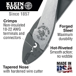 Klein® Crimping/Cutting Tool, 22 to 10 AWG, 9-3/4 in Overall Length, Steel Jaw, Dipped Cushion Grip, Plastic Handle, No Insulated Handle