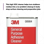 3M™ General Purpose Adhesive Cleaner 08984 removes adhesive residue with ease. The special formula is tough on grime but gentle on paint, vinyl, and fabric when used as directed. The solvent works by softening sticky substances that are often hard to remove with plain water. It penetrates grime and debris, allowing you to wipe it away with ease and leaves behind a clean surface free of film and stubborn adhesive residue. It can be used to clean most types of adhesives, bugs, greases, oils, overspray, silicone, waxes, and tars. This adhesive cleaner is great for collision repair professionals and comes in an easy-to-use spray-on aerosol or a 1-quart can for convenient, quick cleaning applications. Note: Laws controlling the acceptable amounts of Volatile Organic Compounds (VOCs) vary by state, and in some cases by locality. For surface preparation and clean-up activities, consult federal, state, and local regulations regarding use of products containing VOCs in your area. Avoid adhesive residue contamination during auto body repair jobs and other shop work with 3M™ General Purpose Adhesive Cleaner 08984.