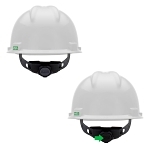 MSA V-Gard® Hard Hat, Front Brim, Standard Size, Fits Minimum Hat Size: 6-1/2, Fits Maximum Hat Size: 8, White, Polyethylene, 4-Point Fas-Trac® III Suspension, ANSI Electrical Class Rating: Class E, ANSI Impact Rating: Type I, Graphics: SBA Logo, Slotted: Yes, Ratchet Adjustment