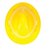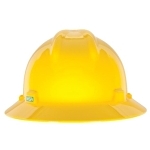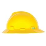 MSA V-Gard® Hard Hat, Full Brim, Standard Size, Fits Minimum Hat Size: SZ 6-1/2 to 8, Yellow, Polyethylene, 4-Point Fas-Trac® III Suspension, ANSI Electrical Class Rating: Class E, ANSI Impact Rating: Type I, Slotted: Yes, Ratchet Adjustment