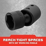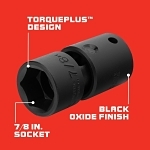Proto® TorquePlus™ Socket, Standard Length Universal, Yes Impact Rated, Measurement System: Imperial, Square Drive, 1/2 in Drive, Flexible Socket, 7/8 in Socket, 2-19/32 in Overall Length, 1/2 in Opening Depth, 1-1/4 in Drive End Width, 1-1/4 in Socket End Width, Side Locking Hole Locking, 6 Points, 3/4 in Bolt Clearance Depth, Alloy Steel, Black Oxide