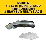 Stanley® InstantChange™ Utility Knife, General Purpose Heavy Duty, 2-7/16 in Blade Length, 3 in Blade Width, Retractable Blade, High Carbon Steel Blade, Number of Blades Included: 3, 6-1/2 in L Handle, Rubber Handle, 3 Points, 8-1/2 in Overall Length