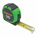 Stanley® Tape Rule, High Visibility, Measuring System: Imperial, 25 ft Blade Length, 1 in Blade Width, Polymer Coated Steel Blade, 16 in/19.2 in Stud Markings, 8 ft Standout, Automatic Rewind, Toggle Locking, 3 Rivets/Tru-Zero® End Hook, Closed Case, ABS Case, Black/Green Case